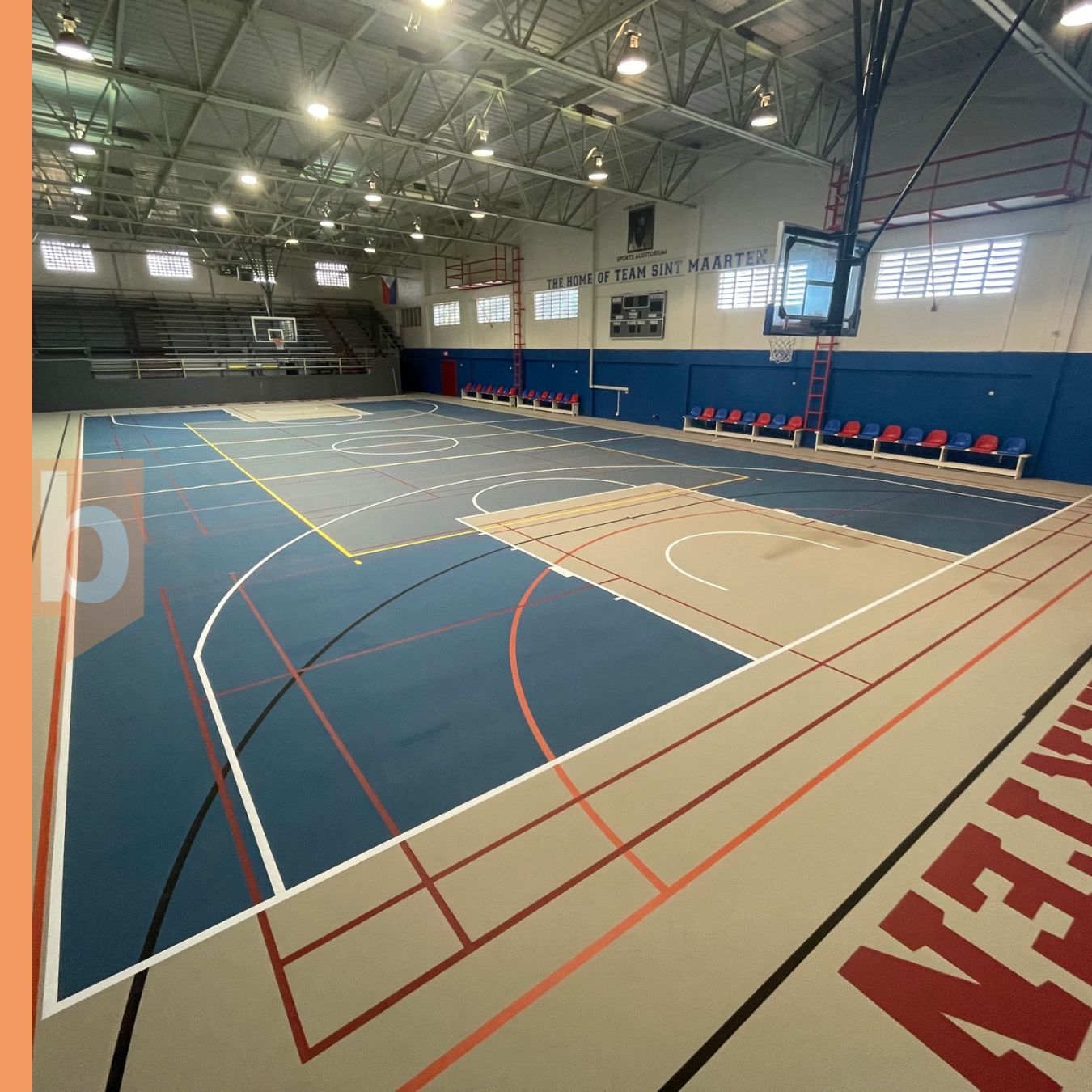 The state-of-the-art surface is FIBA, FIVB, and BWF-certified, making it suitable for basketball, volleyball, netball, badminton, and futsal. Built with a shock-absorbing base and polyurethane layers, the floor ensures durability, comfort, and top-level performance. Adding to the pride of the facility, “Sint Maarten” has been stenciled directly onto the floor.