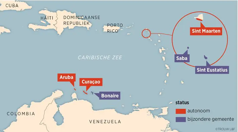 It explains that after the dissolution of the former Netherlands Antilles in 2010, Aruba, Curaçao, and St. Maarten became autonomous countries within the Kingdom, while Bonaire, Saba, and Sint Eustatius became special municipalities under direct Dutch authority.